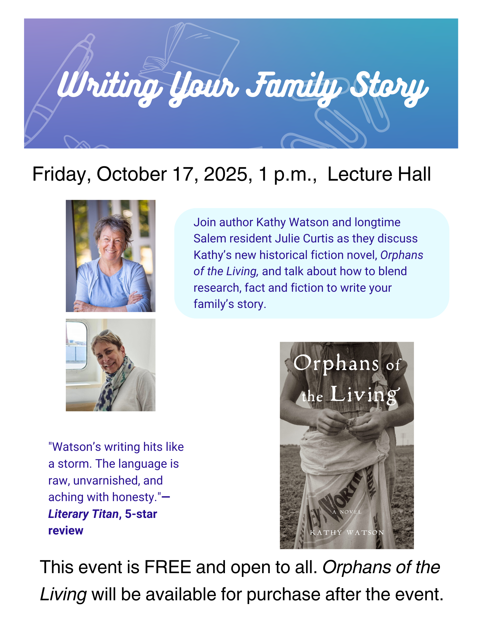 Friday, October 17, 1 p.m. at Center 50+ in Salem, OR. I’ll be in conversation with fifth-generation Oregonian Julie Curtis, and we’ll talk about writing family stories. You can read more about it here.